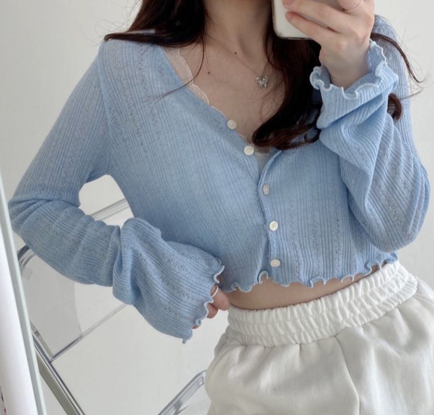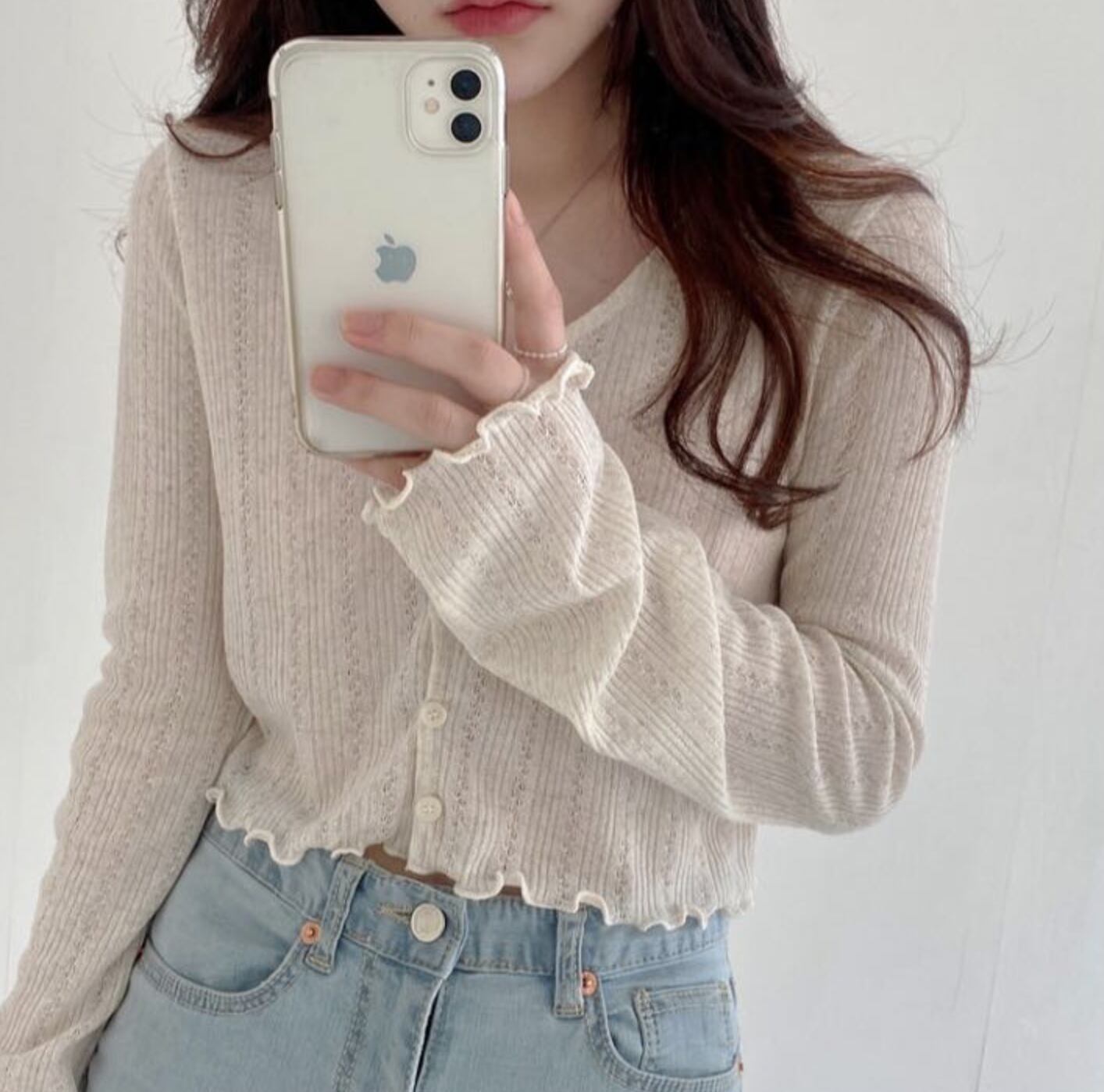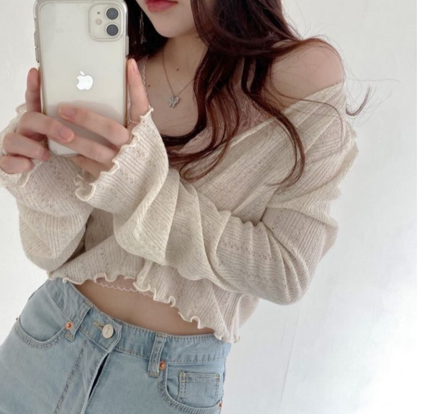 フリル丈の長袖ニットカーディガン ショート丈 トップス