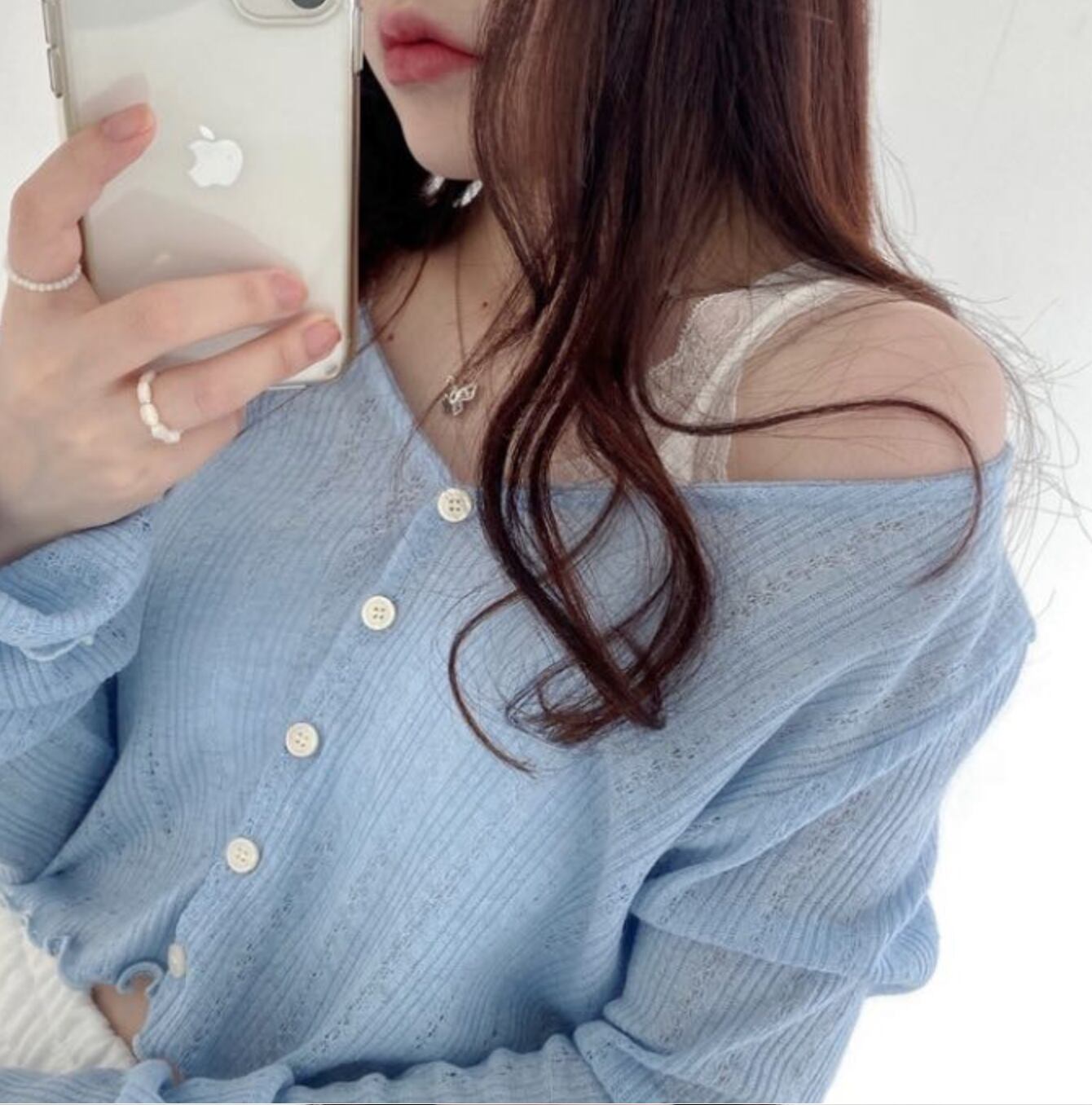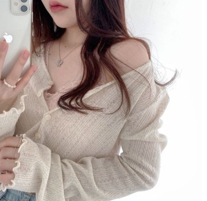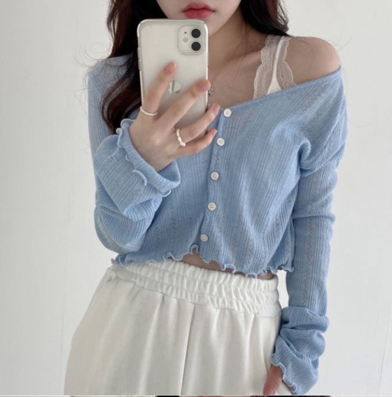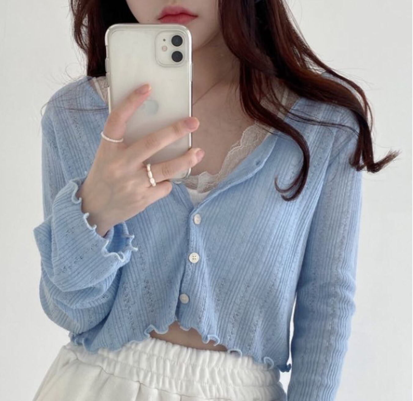 フリル丈の長袖ニットカーディガン ショート丈 トップス