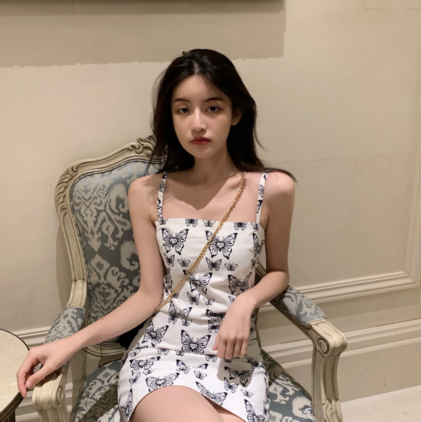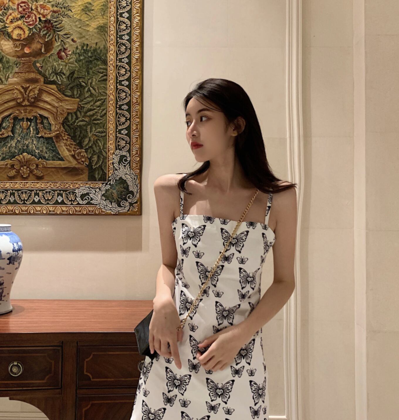 バタフライ柄ワンピース キャミソールワンピース ショート丈